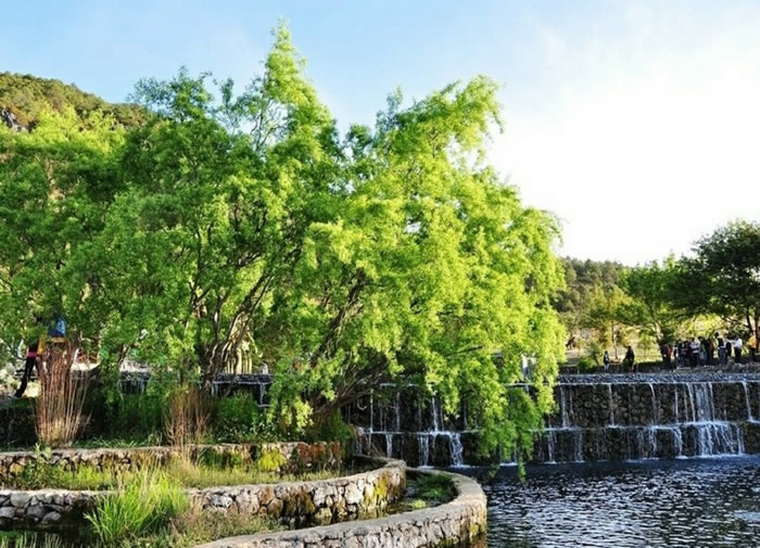 青山抱玉。玉水寨景区位于玉龙雪山南麓、丽江城北十余公里,是丽江坝的主要水源地之一。整个景区东、西、北三面,是常年郁郁葱葱的青松山林,南面朝丽江坝子倾斜,景区北端一道山崖下,两株被列入云南古树名录的千年古树,枝叶繁茂,双树成林。古树下一股流量为每秒0.5立方米的清泉喷涌而出,带着水花向南流,注满一个又一个玉水潭,形成三叠水瀑布群。